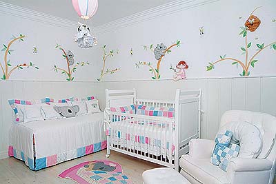 Depois de escolher a cor das paredes, é hora de decidir se vai usar tinta comum ou papel de parede com motivos infantis que são muito lindos, se preferir a tinta comum, poderá realçar uma das paredes com um grande adesivo com desenhos fofos e coloridos;